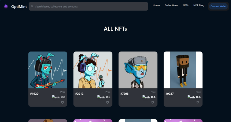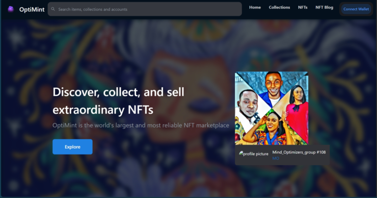 OptiMint is an NFT marketplace platform built for discovering, collecting, and trading digital assets. The platform provides a reliable and user-friendly environment for creators, collectors, and investors to explore NFT collections, track marketplace activity, and engage with blockchain-based assets.